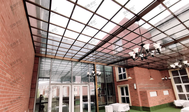 頂部用的是2.0mm聚碳酸酯板材,透光性能好(透光率88%)在陽光下曝曬不會產(chǎn)生黃變、霉化、透光不佳。表面有防紫外線的共擠層(uv涂成),可防止太陽紫外線引起的樹脂疲勞變黃。表面共擠層具有化學(xué)吸收紫外線并轉(zhuǎn)化為可見光。