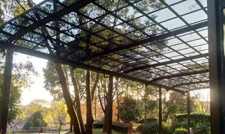 頂部用的是2.0mm聚碳酸酯板材,透光性能好(透光率88%)在陽光下曝曬不會產生黃變、霉化、透光不佳。表面有防紫外線的共擠層(uv涂成),可防止太陽紫外線引起的樹脂疲勞變黃。表面共擠層具有化學吸收紫外線并轉化為可見光。對植物光合作用有良好的穩定效果,極適合保護汽車使其免受紫外線破壞。