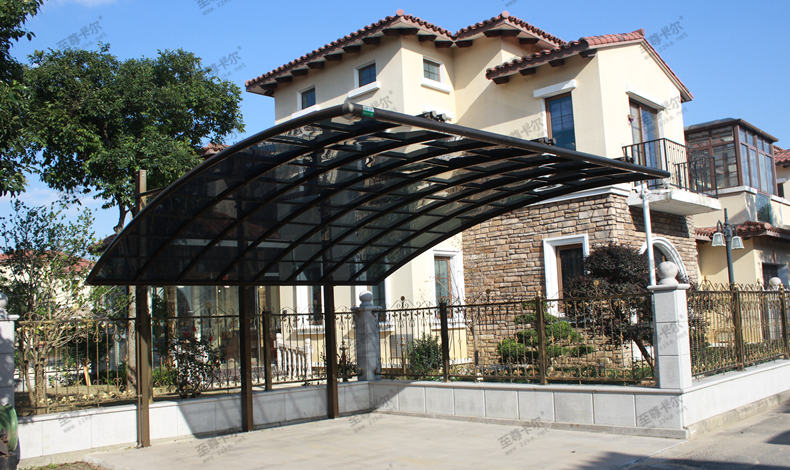 在骨架方面,鋁合金骨架耐腐蝕,不易生銹,表面做電泳涂層工藝,可以定制多款顏色,在金屬質(zhì)感的映襯之下,更顯大方美觀,實(shí)用性和美觀性完美契合。別墅汽車車棚效果圖上可以看得出來,非常有質(zhì)感。